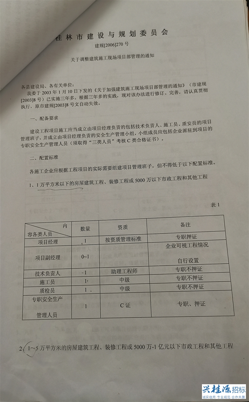 3、桂林建設(shè)與規(guī)劃委員會(huì)建規(guī)【2006270號(hào)《關(guān)于調(diào)整建筑施工現(xiàn)場(chǎng)項(xiàng)目部管理的通知》詳見(jiàn)公告附件1